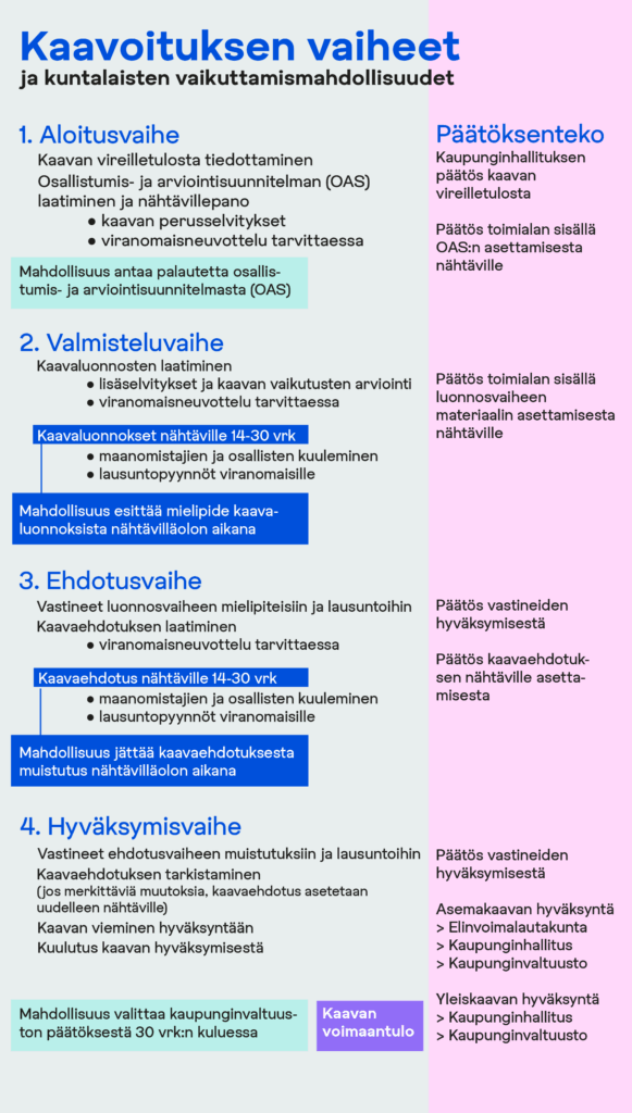 Suunnittelun käynnistyessä kaavasta laaditaan osallistumis- ja arviointisuunnitelma (OAS), jossa kerrotaan kaavan osalliset, osallistumis- ja vuorovaikutusmenettelyt, tavoitteet sekä alustava aikataulu.