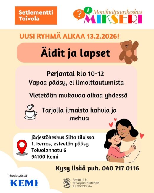 Monikulttuurikeskus Mikserin uusi, kaikille avoin ja maksuton Äidit ja lapset -ryhmä alkaa 13.2.2026!
