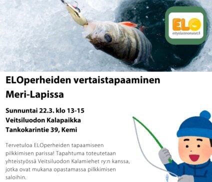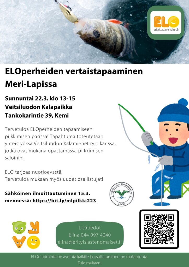 Tervetuloa ELOperheiden vertaistapaamiseen pilkkimisen parissa! Tapahtuma toteutetaan yhteistyössä Veitsiluodon Kalamiehet ry:n kanssa, jotka ovat mukana opastamassa pilkkimisen saloihin.