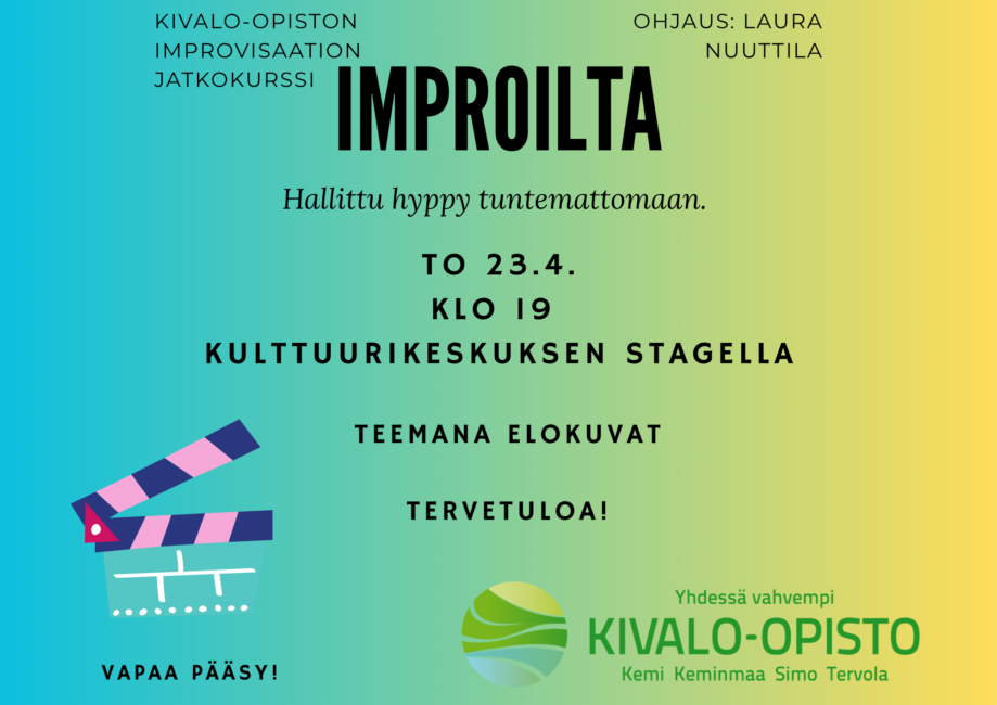Kivalo-opiston improvisaation jatkoryhmä heittäytyy rohkeasti elokuvien maailmaan. Illan aikana nähdään välähdyksiä harjoituksista, tutustutaan erilaisiin improvisaatiotekniikoihin ja sukelletaan improajien mielikuvitukselliseen elokuvamaailmaan.