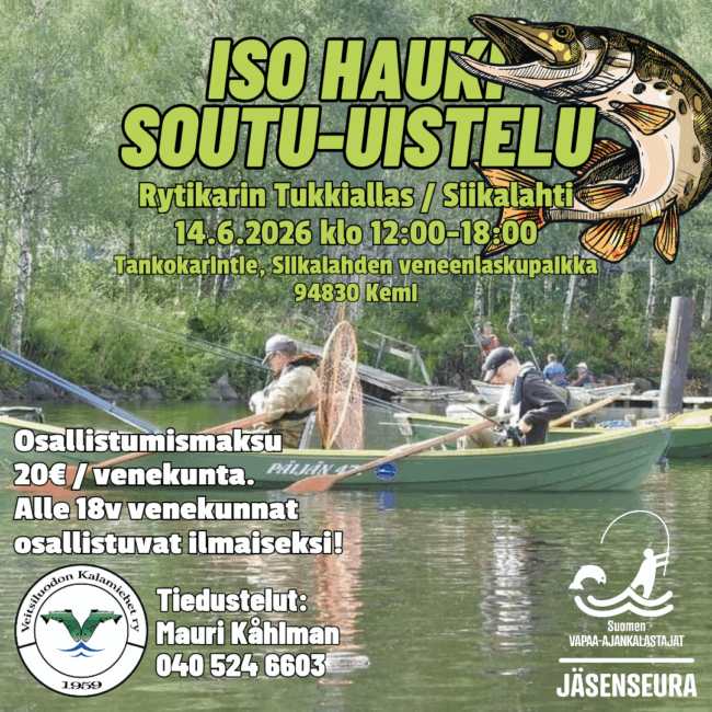 Iso Hauki Soutu-uistelu järjestetään 14.6.2026 kello 12-18 Tukkialtaalla Siikalahdella. Lähtöalue Tankokarintie, Siikalahden veneenlaskupaikka 94830 Kemi.