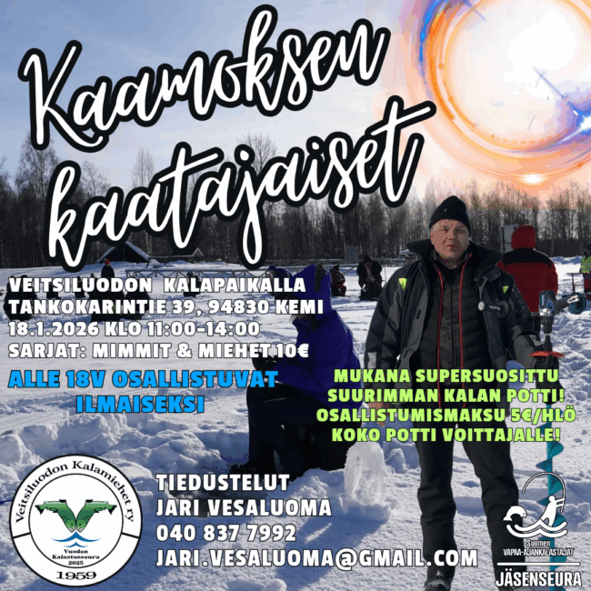 Kaamoksen Kaatajaiset Veitsiluodon Kalapaikalla (Tankokarintie 39, 94830 Kemi) sunnuntaina 18.1.2026 kello 11-14. (Tapahtuman aika päivitetty 8.1.2026!)