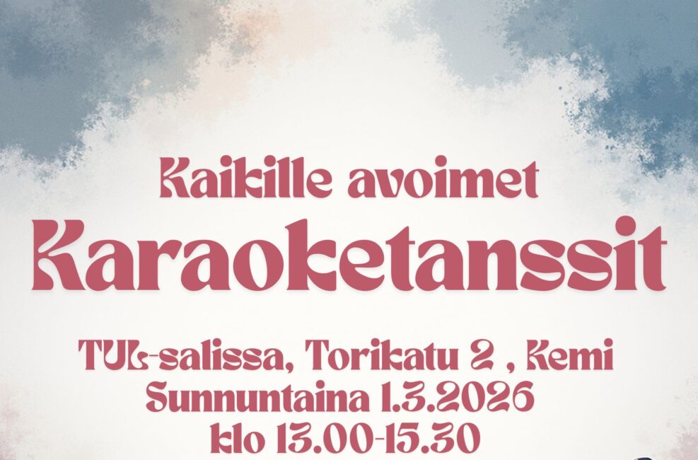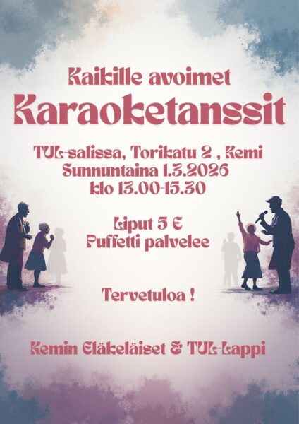Sunnuntaina 1.3.2026 kello 13-15.30 järjestetään kaikille avoimet karaoketanssit TUL-salissa Torikatu2:ssa. Liput 5 euroa, puffetti palvelee.
