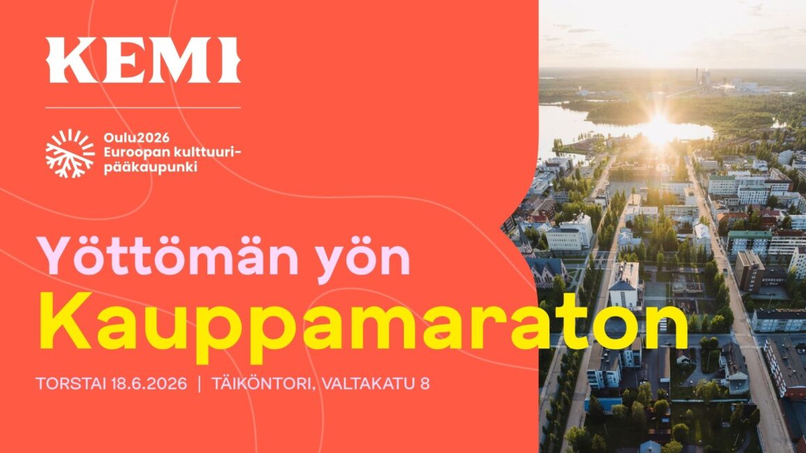 Yöttömän yön Kauppamaraton valtaa Kemin keskustan jälleen juhannusviikon torstaina 18.6.2025. Täiköntori ja keskusta täyttyvät toiminnasta ja iloisesta kesätunnelmasta, ohjelmaa riittää koko päiväksi!