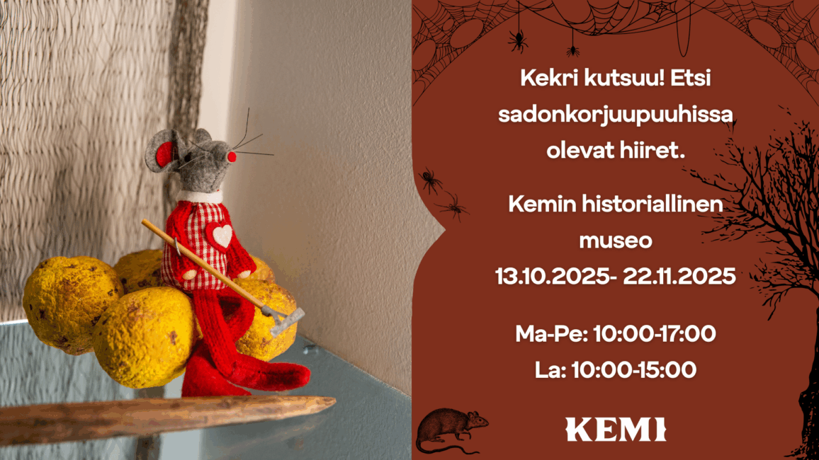 Museon pienet hiiret ovat päättäneet viettää omaa kekriään! Ne ovat saapuneet salaa näyttelyyn juhlistamaan sadonkorjuuta: osa on keräämässä vihanneksia, toiset kantavat omenoita tai koristelevat pöytää juhlaa varten. Sinun tehtäväsi on auttaa museohiiriä juhlimaan kekriä! Etsi kuvavihjeiden avulla kaikki näyttelyyn piiloutuneet hiiret. Kaikkien hiirten löytäjälle pieni palkinto!