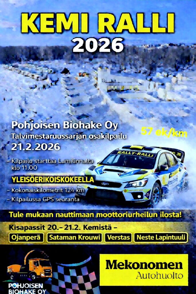 Kemi Ralli starttaa 21.2.2026 kello 11 Kemin Lumilinnalta. Kilpailu koostuu seitsemästä erikoiskokeesta, joista kolme ajetaan kahteen kertaan, ek-reittien yhteispituus on 57 kilometriä. Tarjolla kilpailuun on kauniin talvisen Kemin ja lähiympäristön alueita.