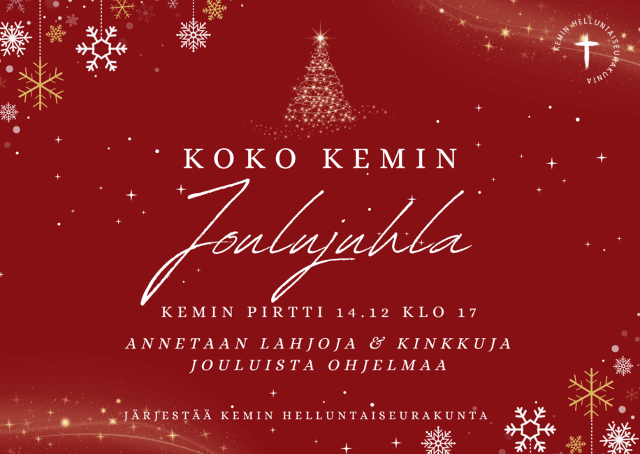 🎁 Varaa päivä ja tule mukaan koko perheen joulujuhlaan – joulu saa tulla! Illan aikana luvassa joulun tunnelmaa, musiikkia ja iloista yhdessäoloa. Kaikki ovat tervetulleita – yksin, perheen tai ystävien kanssa. Tule kokemaan joulun lämpö ja yhteys keskellä Kemiä. Jaamme myös lahjoja sekä joulukinkkuja niitä tarvitseville, näitä on rajoitettu määrä.