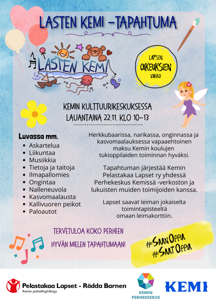Lapsen oikeuksien viikkoa juhlitaan Lasten Kemi -tapahtumassa Kemin kulttuurikeskuksessa lauantaina 22.11.2024 kello 10-13. Tapahtuma on täysin maksuton ja avoin kaikille lapsille perheineen. Lapsen oikeuksien vuoden teema on ”Jokaisella lapsella on oikeus kuulua”!
