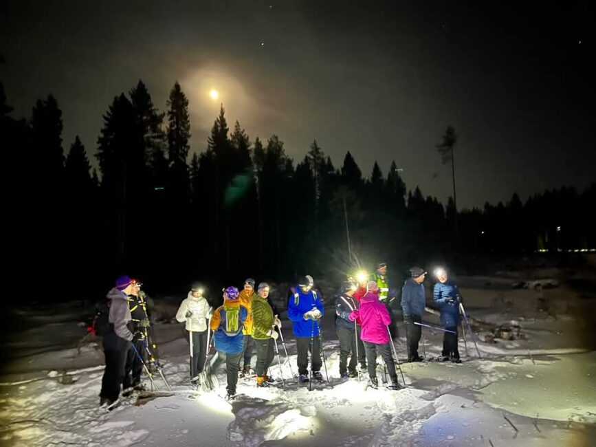 Reitti sopii myös liukulumikengille. Kävellään noin kaksi tuntia rauhallista vauhtia, taukoja pidellen. Ota omat lumikengät tai liukulumikengät, sauvat, otsalamppu, ja juotavaa mukaan. Järjestäjällä ei ole lainattavia varusteita.