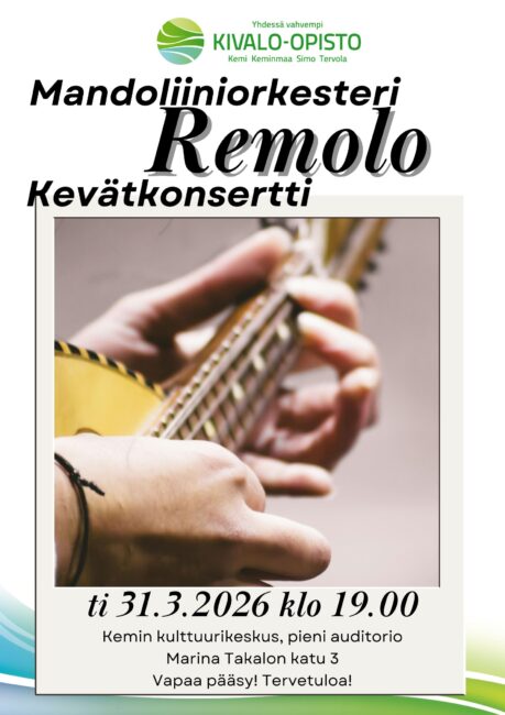 Tervetuloa nauttimaan keväisestä musiikki-illasta Kivalo-opiston mandoliiniorkesteri Remolon kevätkonsertissa tiistaina 31.3.2026 kello 19!