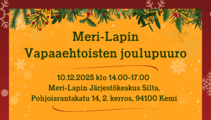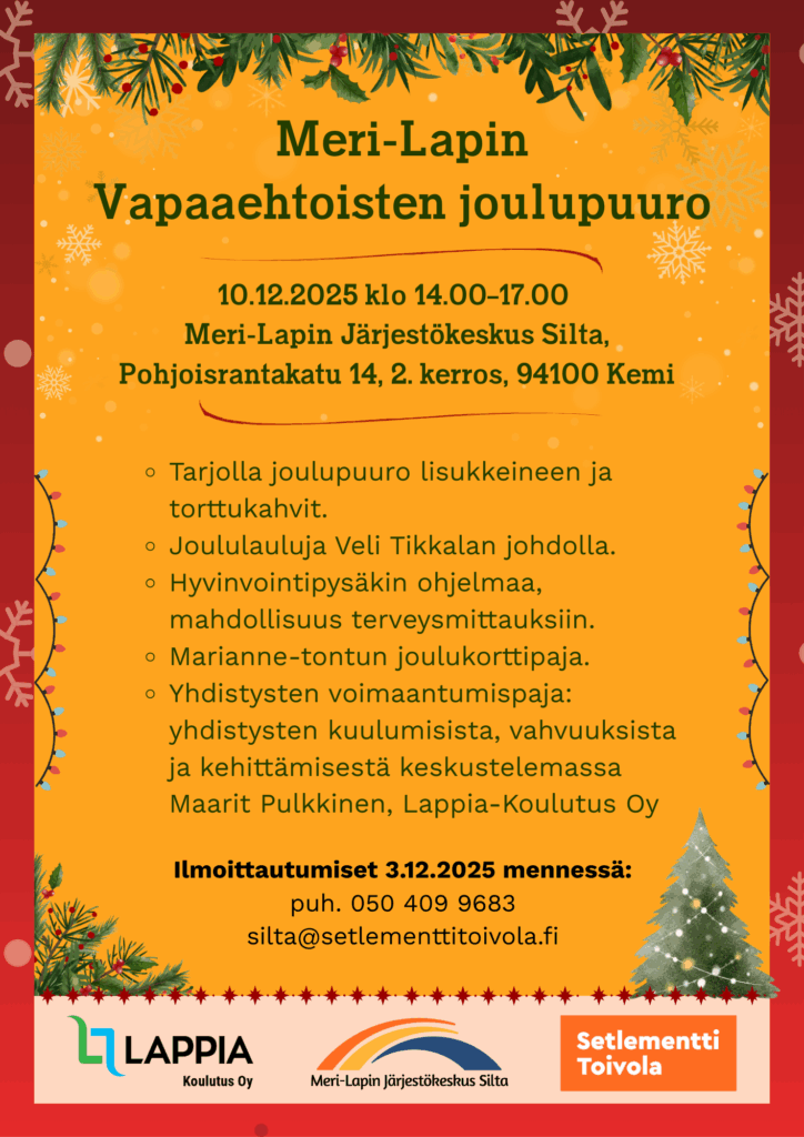 Järjestökeskus Silta ja Lappia-Koulutus Oy järjestävät joulupuurotapahtuman alueen vapaaehtoisille keskiviikkona 10.12.2025.