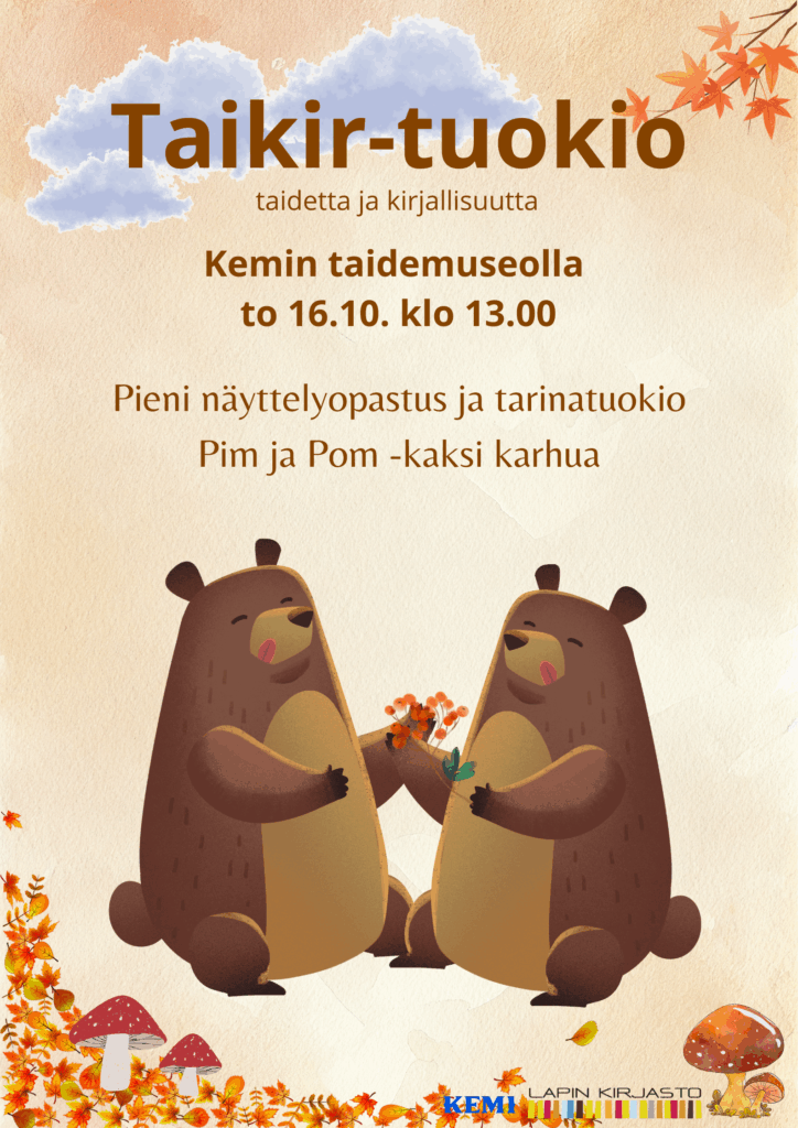 Kemin taidemuseossa järjestetään 16.10.2025 kello 13 lapsille ja lapsenmielisille pieni taidetuokio, joka yhdistää taidetta ja kirjallisuutta.