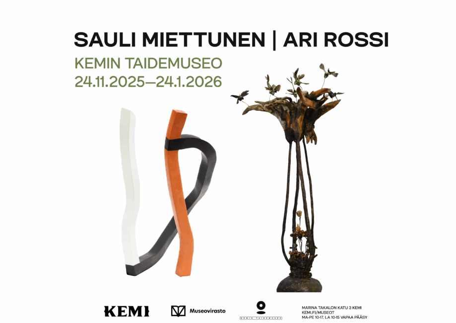 Kemin taidemuseossa avautuu näyttely, jossa kaksi kuvataiteilijaa – Sauli Miettunen ja Ari Rossi – kohtaavat veistotaiteen äärellä. Molemmat ovat Lahden taideinstituutista valmistuneita taidemaalareita, jotka ovat vuosien varrella siirtyneet kolmiulotteiseen ilmaisuun. Näyttely tuo esiin heidän omaleimaiset lähestymistapansa materiaaliin, muotoon ja tilaan.