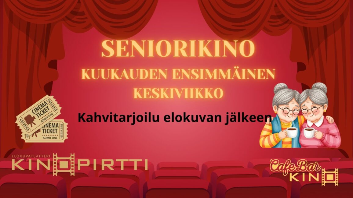 Kinopirtin Seniorikinot järjestetään aina kuukauden ensimmäisenä keskiviikkona. Tarkista elokuvateatterin kotisivuilta näytettävät elokuvat ja tarkat esitysajat. Seniorikinon lipulla saa kahvit ja kahvileivän elokuvan jälkeen CafeBarKinossa!