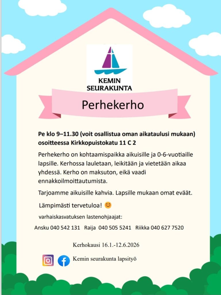 Kemin seurakunta järjestää Perhekerhoa perjantaisin kello 9-11.30 osoitteessa Kirkkopuistokatu 11 C 2. Voit osallistua kerhoon oman aikataulusi mukaan. Kerhokausi 16.1.-12.6.2026.