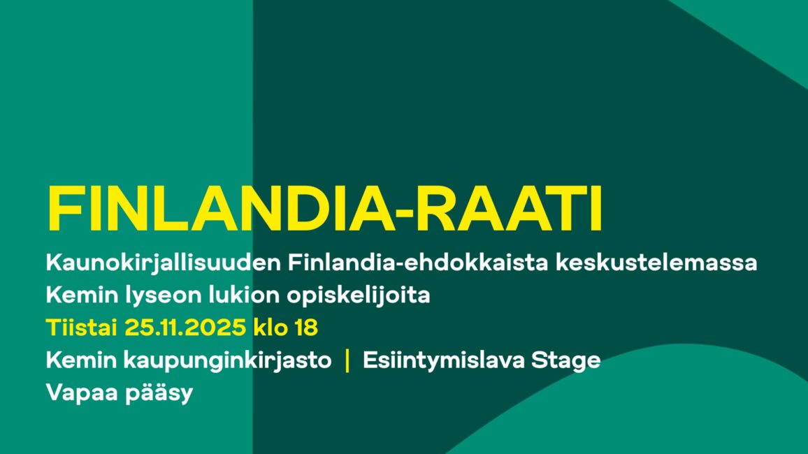 Tiistaina 25.11.2025 kello 18 alkaen kulttuurikeskuksen esiintymislava Stagella raaditaan vuoden 2025 kaunokirjallisuuden Finlandia-ehdokkaat! Ehdokkaista keskustelemassa Kemin lyseon lukion opiskelijoita.