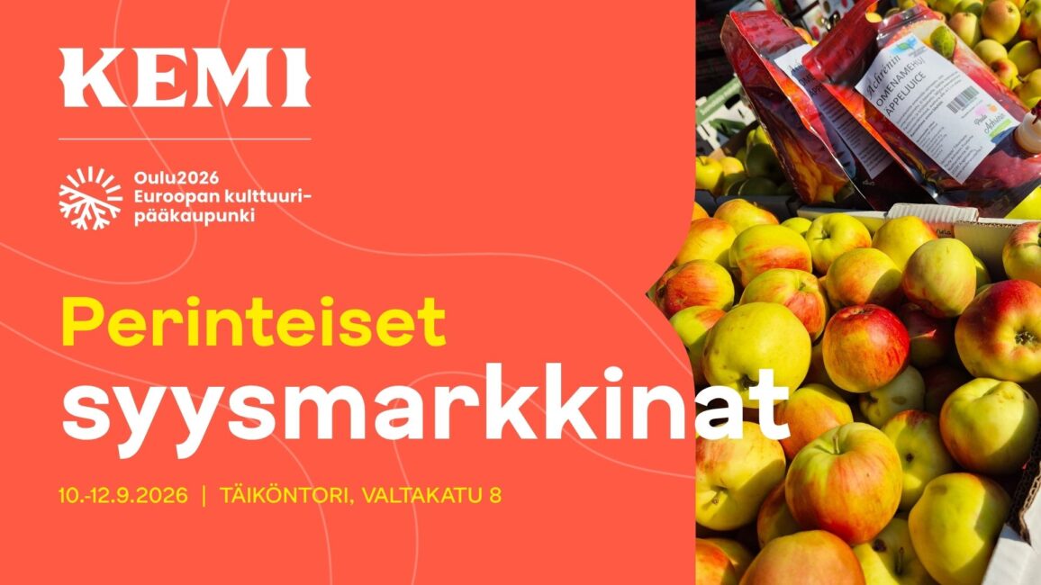 Kemin syysmarkkinat järjestetään torstaista lauantaihin 10.-12.9.2026. Markkinat ovat avoinna torstaina ja perjantaina kello 10-17 sekä lauantaina kello 10-14.