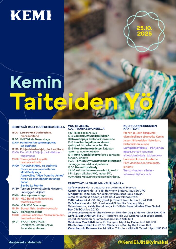 Kaupungin tapahtumatoimisto, kulttuuripalvelut ja nuorisotyö järjestävät kulttuurikeskuksella koko päivän tapahtuman, minkä lisäksi kaupungin yritykset ja yhdistystoimijat järjestävät monipuolista ja tasokasta ohjelmaa. Taiteiden yön ohjelmaa päivitetään tälle sivulle sitä mukaa kuin sisällöt varmistuvat!