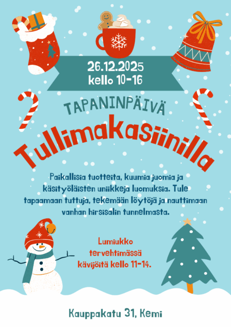 Tapaninpäivä tarjoaa täydellisen hetken lähteä pienelle ajelulle tai kävelylle ja samalla kertaa voit poiketa Tullimakasiinille ihailemaan paikallisia tuotteita sekä käsityöläisten ainutlaatuisia luomuksia. Voit pysähtyä nauttimaan kupillisen kuumaa kaakaota tai glögiä, vaihtaa kuulumisia tuttujen kanssa ja tunnelmoida vanhan hirsisalin ainutlaatuisessa miljöössä. Tapaninpäivänä Tullimaksiini kutsuu viihtymään ja löytämään jotakin erityistä – itselle tai lahjaksi.