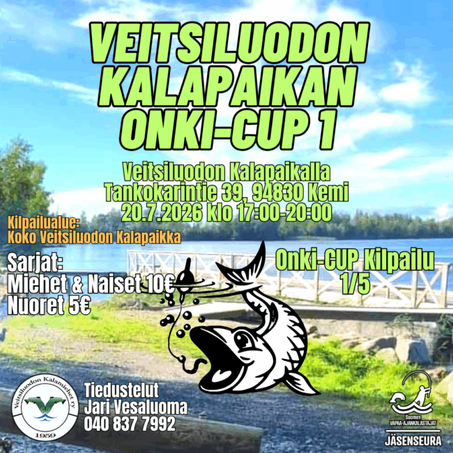 Veitsiluodon Kalapaikan Onki-CUP 1 järjestetään maanantaina 20.7.2026 kello 17-20 Veitsiluodon Kalapaikalla, osoite Tankokarintie 39, 94830 Kemi.