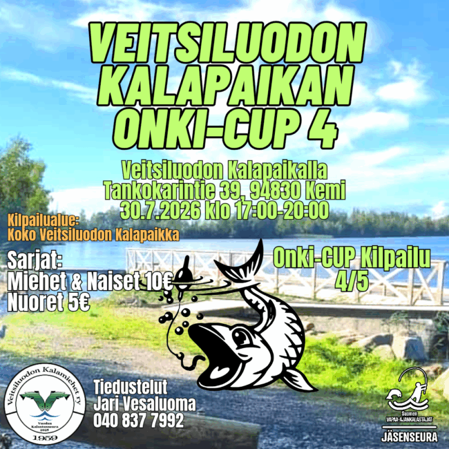 Veitsiluodon Kalapaikan Onki-CUP 4 järjestetään Veitsiluodon Kalapaikalla torstaina 30.7.2026 kello 17-20, osoite Tankokarintie 39, 94830 Kemi.