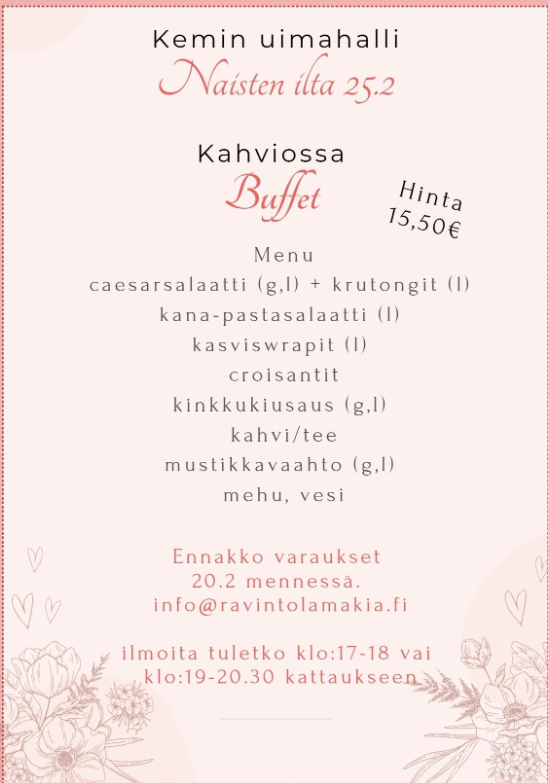 Kahvila Makiasta on mahdollista varata maukas iltapalabuffa hintaan 15,50 euroa. Varaukset tulee tehdä perjantaihin 20.2. mennessä numeroon 040 818 5912.
