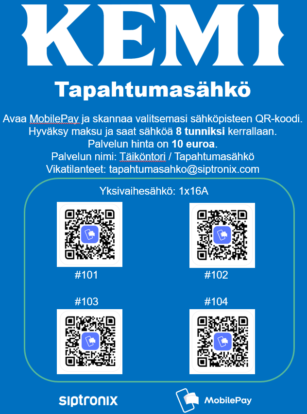 Sähkön käyttö Täiköntorilla onnistuu skannaamalla kyltistä QR-koodi ja maksamalla Mobilepaylla.