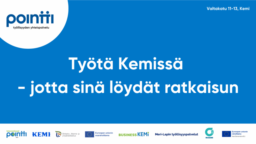 Pointti tarjoaa työllisyyspalvelut yksilöllisesti tarpeidesi mukaan yhdestä paikasta. Edistämme työllistymistä uudella tavalla yhteistyössä Kemin kaupungin, Meri-Lapin työllisyyspalveluiden, Ammattiopisto Lappian sekä muiden oppilaitosten ja sidosryhmien kanssa.
