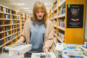 Kirjaston neuvontapisteen vieressä on palapelien vaihtopiste.